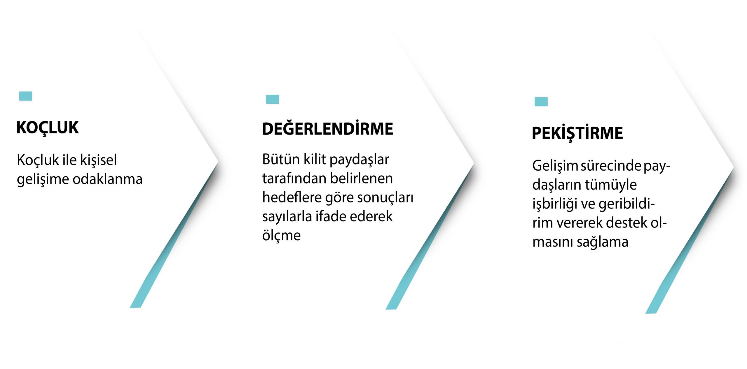 Sürecin odağında koçluk süreci ve bireysel gelişim vardır. Sürece dahil olan bütün kilit paydaşlar sonuçları değerlendirir ve pekiştirir.